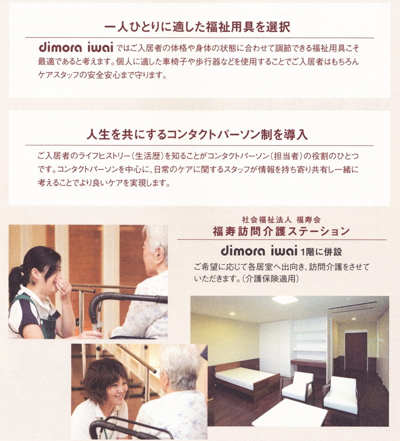 いままで培ってきた成蹊会グループのノウハウを、存分に取り入れたケアサービスをモットーに、dimora iwaiはご入居者を常に中心に考える有料老人ホームです。