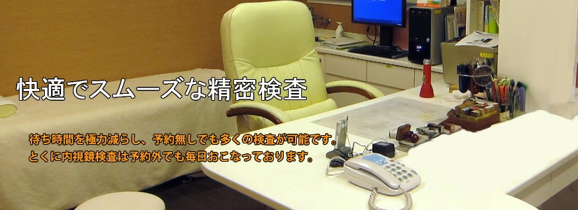 オリンパスの最新鋭内視鏡システム(EVIS LUCERA ELITE)での胃内視鏡、大腸内視鏡、経鼻胃内視鏡(鼻から挿入する内視鏡)による観察(NBI観察も可能)と早期癌・ポリープ切除などの処置を行っています。また全例コンピューターでの録画を行い、検査後に録画映像にて詳細な説明を行います。さらにコンピューターファイリングシステムによる迅速な診断を行っております。